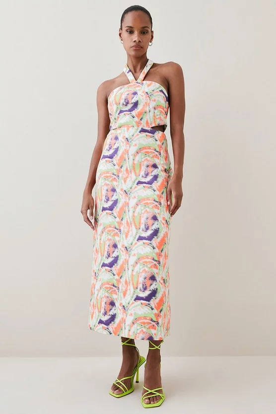 Add some colour to your summer wardrobe with this halterneck midi dress. Boasting an abstract print, side cut-outs and an alluring open back, this style will keep you fresh and elegant.