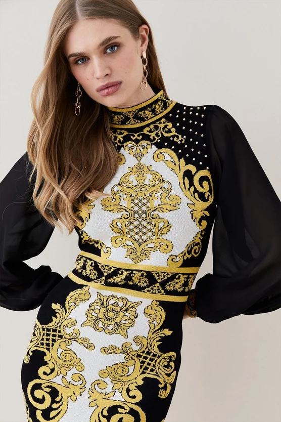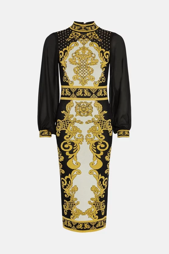 A curve-sculpting style with a regal twist. This jacquard knit midi dress boasts a bold Baroque print offset by voluminous mesh sleeves and comes cut high to the neck for a modern finish. Skimming the figure in all the most flattering places, it reveals an open back cut-out to show off a sophisticated sliver of skin.