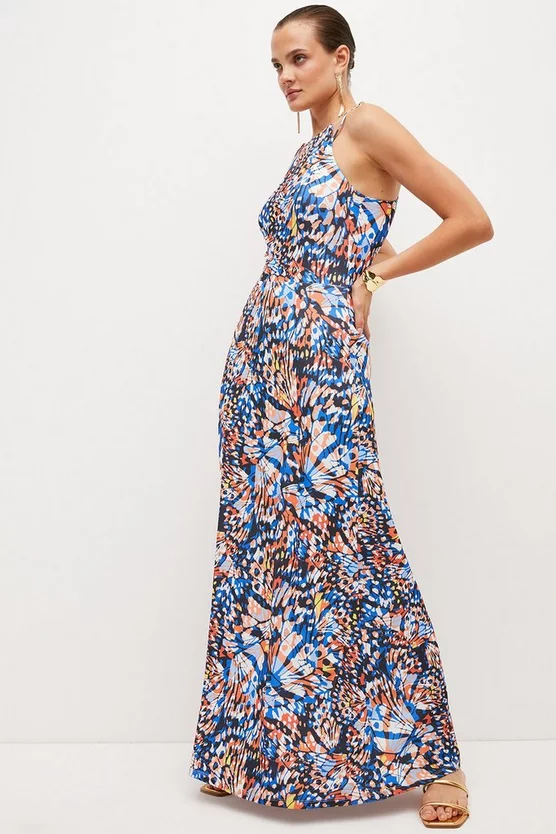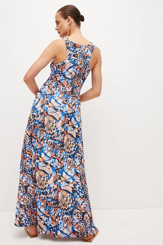 Emblazoned in the print of the season β a cascade of fluttering butterfly wings β this slinky jersey maxi dress is sure to stand out. A square neckline comes complemented by chain-link straps for a touch of opulent texture, anchoring a floor-sweeping piece youβre sure to fall for.