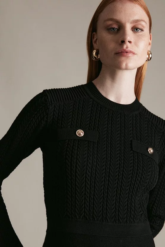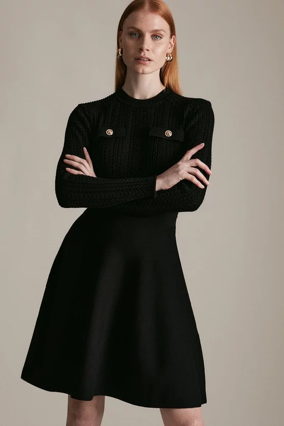 Demonstrating that simple is often best, this feminine skater dress is a one-piece-wonder for year-round styling. Completed with a cable knit detail on the body, embellished with military style buttons, it’s complimented by the fluidity of the mini skirt. Style with a leather jacket and heeled courts for day-to-evening elegance.