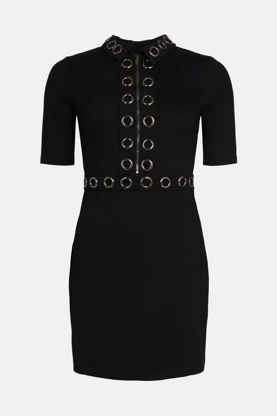 A jersey dress is a forever-investment in any wardrobe. In a premium stretch material for comfort and flexibility, its decorated with eyelet details across the collar, front and waistband, its crafted to follow the silhouette of your body, enhancing it at its very past. Zipped at the front, pull together a considered, signature look by layering with a trench coat.