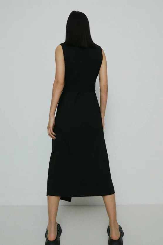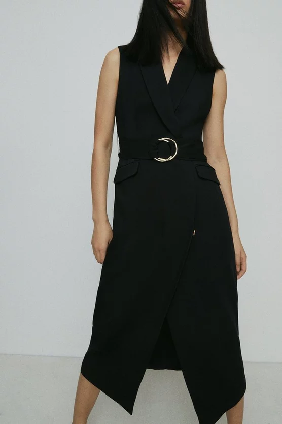 Enter a bold new era of modern power dressing, starting with this sleek sleeveless tux dress. With its androgynous design details ? think sharp lapels, a sporty ring belt and flap pockets ? this alluring asymmetric design strikes a seriously sophisticated style note, in the boardroom and beyond.