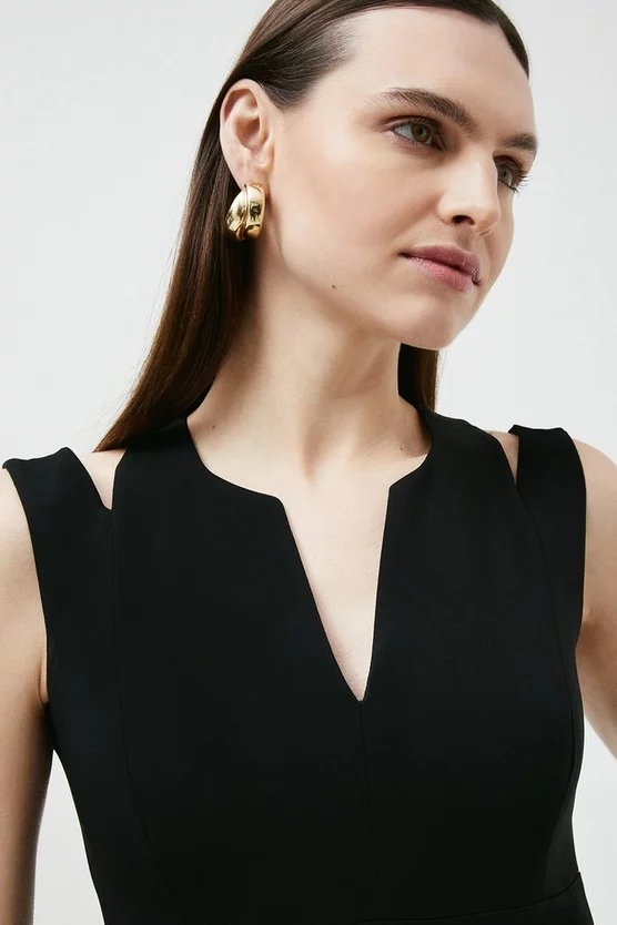 Made from our signature compact stretch fabric, this dress is soft to the touch and has four-way stretch so it always fits like a glove โ perfect for all-day wear. Designed with cut-out panels, carefully placed seams and a knotted back, the bodice beautifully emphasises your frame. Pulled together by a self-tie belt thatโs detailed with luxe stitching and metalwork trims, the piece flows into a ruffled wrap-over skirt that gracefully grazes the ankles.