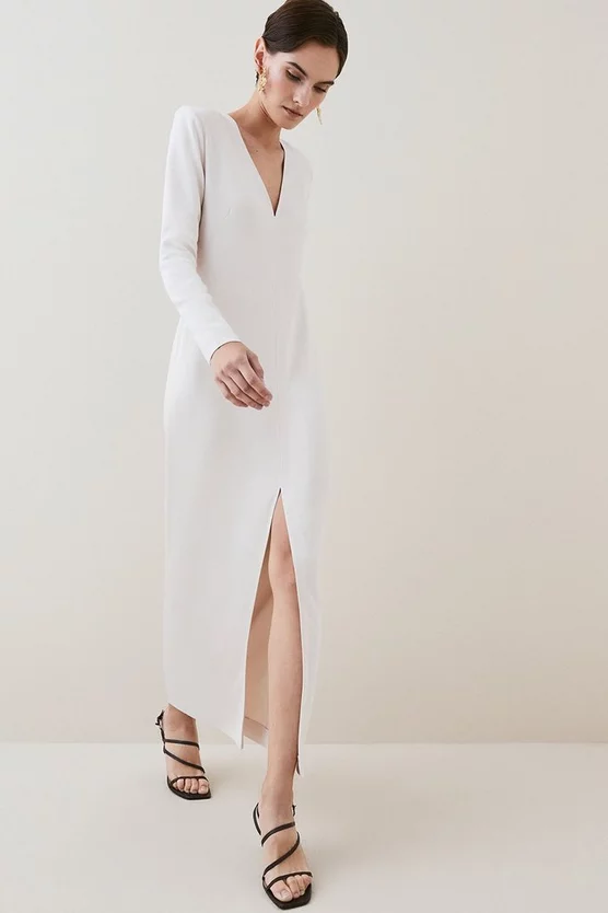 Cascading with a languid flow, this maxi dress is the epitome of elegance. Balancing an angular V-neckline with a split hem, pair this style with colour pop stilettos for a vibrant finishing touch.