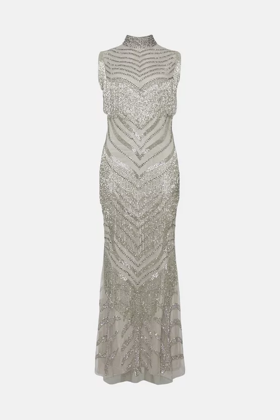 A style that sparkles beautifully beneath the moonlight, this Art Deco-inspired maxi dress glimmers with beaded tassels and opulent embellishments. Our designers have added a high neckline and sleek, sleeveless finish to modernise the glamorous details, and finished the look with a swishy hemline and gauzy, semi-sheer overlay.