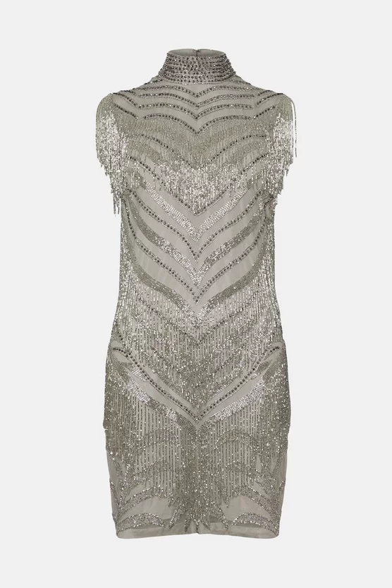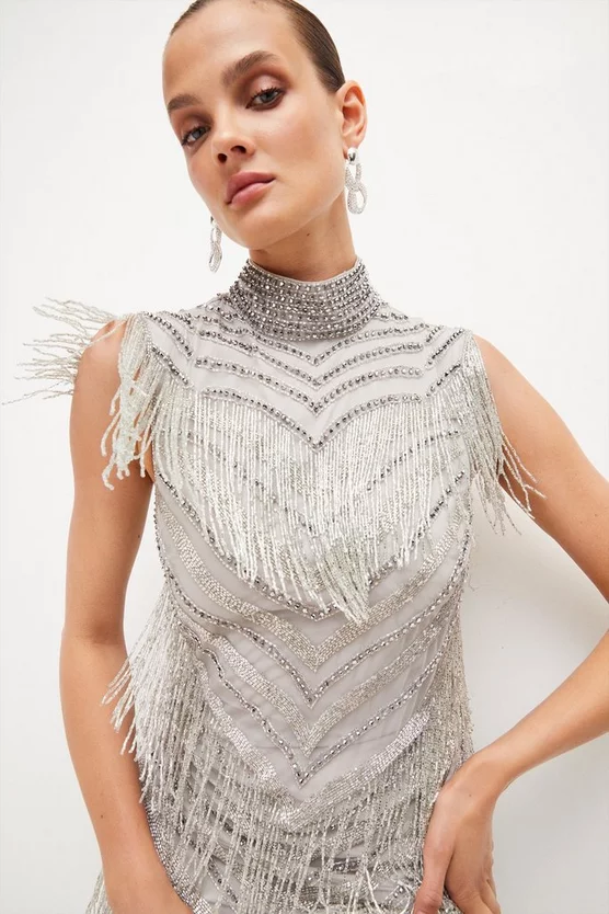 Shimmy your way into your next summer party in this striking crystal-embellished piece. Detailed with tiers of swishy beaded tassels and hundreds of light-catching embellishments, itβs sure to catch your eye and looks oh-so-luxurious paired with metallic stilettos and swept-back hair.