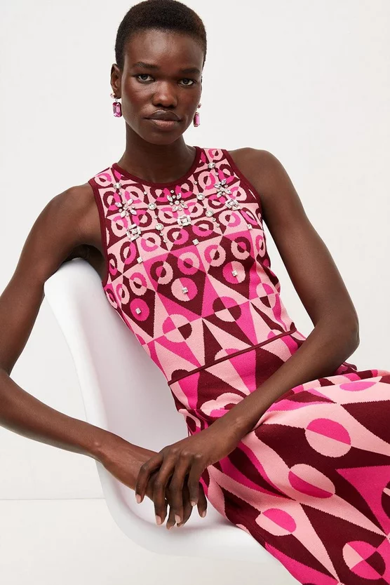 Trimmed with light-catching crystals, this sleek jacquard swing dress nods to the 1960s with its bold geometric print. Fitted to the figure at the top and flaring out at the hem, it effortlessly elongates the legs and pairs perfectly with chunky platforms.