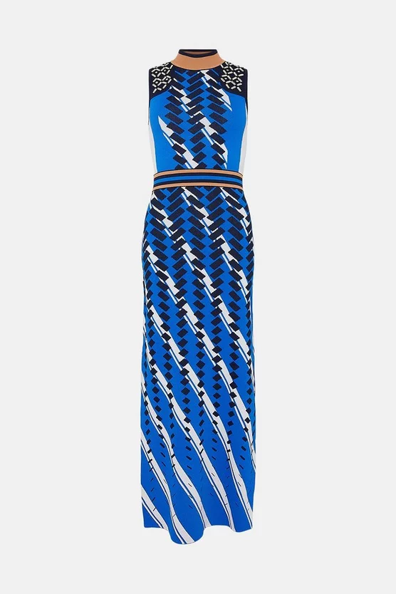 Life in colour. This exceptionally vibrant geo-print maxi dress combines a sculpting column silhouette with clusters of light-catching crystals, a funnel neckline and sultry hem split. Banded at the waist with sporty contrast stripes, it makes a unique impression at new-season soirees.