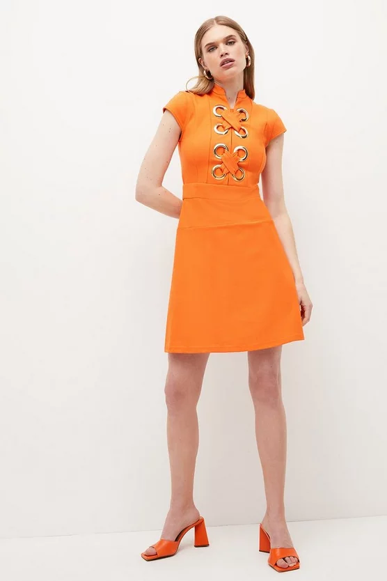 Boldly finished with an oversized eyelet trim across the chest, this jersey dress is cut in an A-line fit as an effortlessly flattering design. Collared at the neck, it features a cap sleeve on the arms, is panelled at the back and secured with a hidden zip. Pair with Mary Jane shoes as a timeless combination.