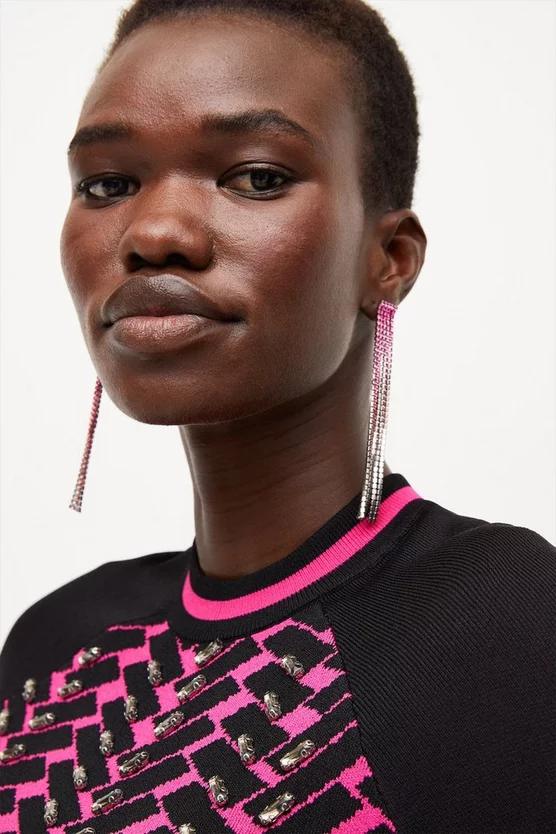 A bodycon dress that makes a bold impact. Detailed with an all-over geometric motif and sporty striped trims, this streamlined design was designed to enhance and accentuate feminine curves. Contrast short sleeves further add to its athletic silhouette and undeniably sultry appeal.