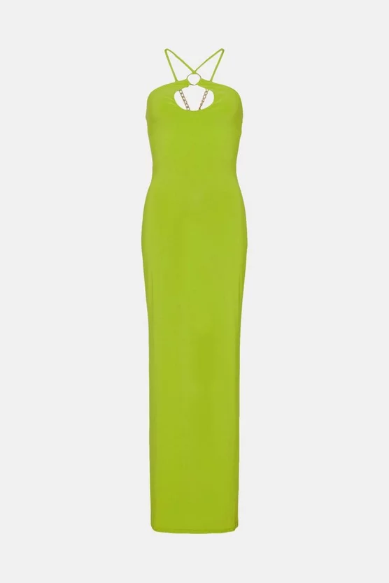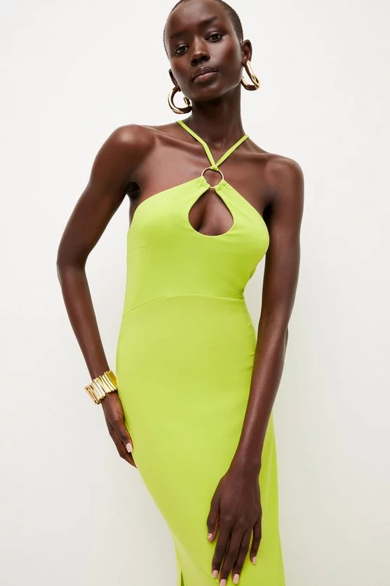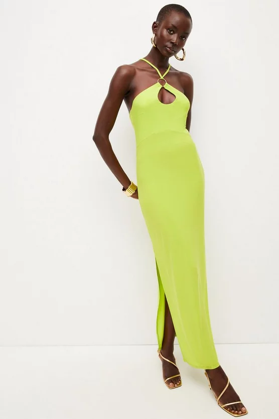 Steal the show at balmy summer get-togethers in this beautifully cut maxi dress. Spun from slinky, colour-pop fabric that hugs curves in all the right places, it accentuates your flirtatious streak with a daring front cut-out and sultry side hem split. Forgo your favourite necklace in favour of some trend-led hoops to let the unique clasp-detail halter neckline shine.