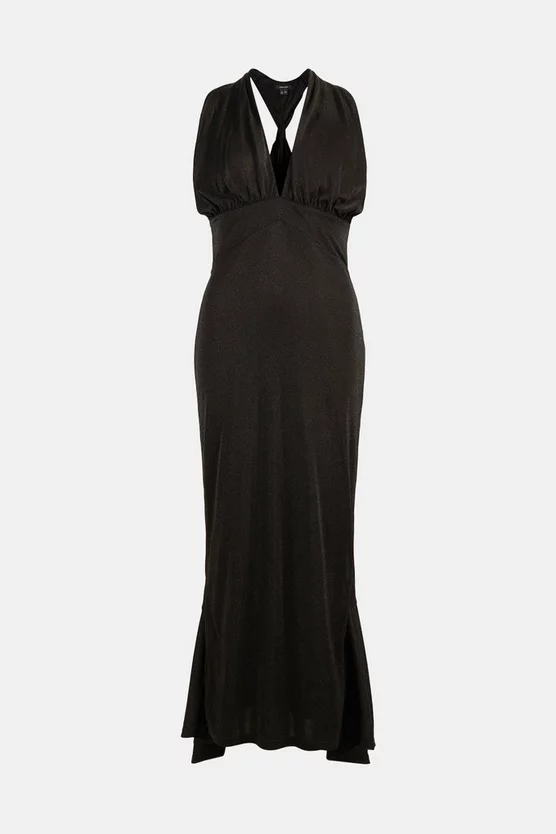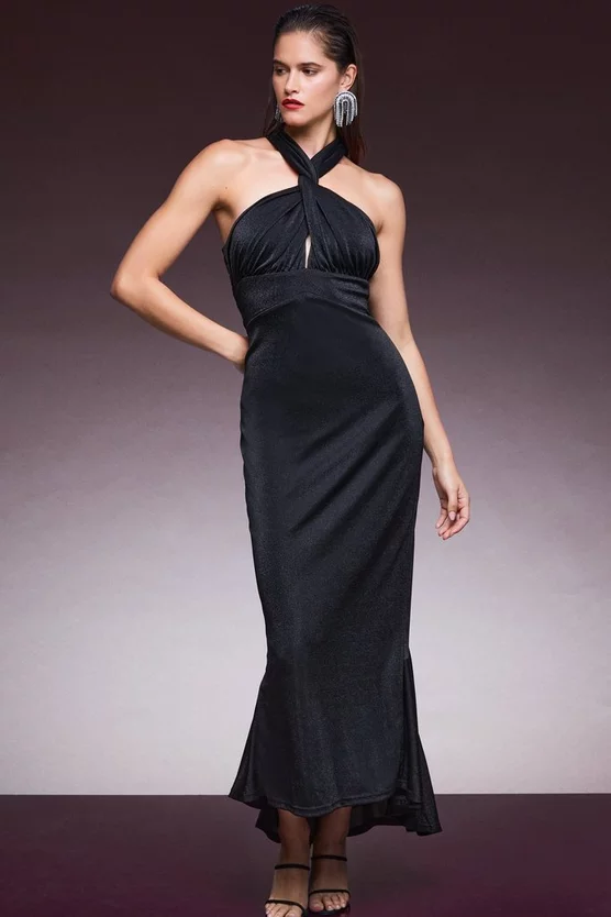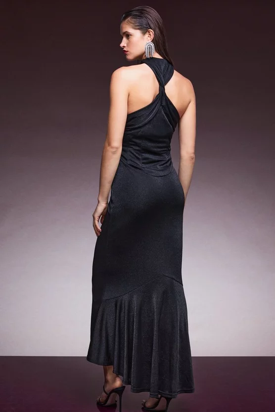 Get set to sparkle. Draped to the floor for a dramatic effect, our elegant jersey maxi dress is worthy of any red carpet or black-tie ball. It comes speckled with subtle sparkles for a party-ready vibe and features a twisted neck detail and flirty front cut-out.