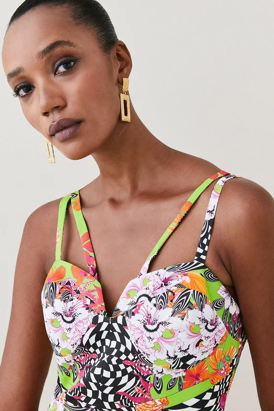 Abstract florals define the contemporary composition of this mini dress. Ultimately modern, this sculpting piece has a caged neckline and corset-inspired bodice, calling to be paired with colour pop stilettos for a cohesive finish.