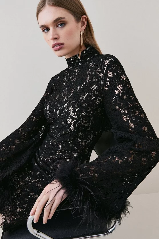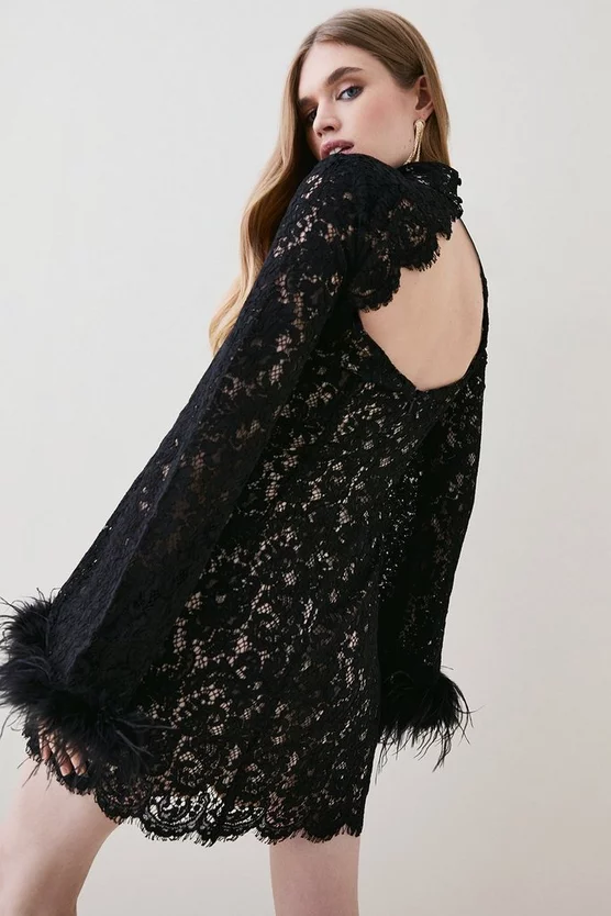 Blooming with botanical embroidered mesh, this mini dress channels the majesty of the midnight hour with an intoxicating ensemble. From the feather-trimmed cuffs to the scalloped open back, pair this piece with towering platforms to offset the after-dark references.