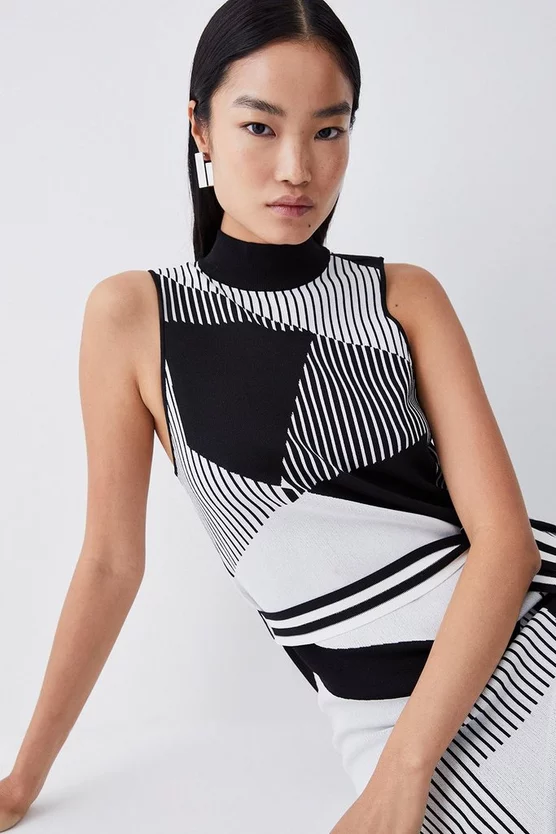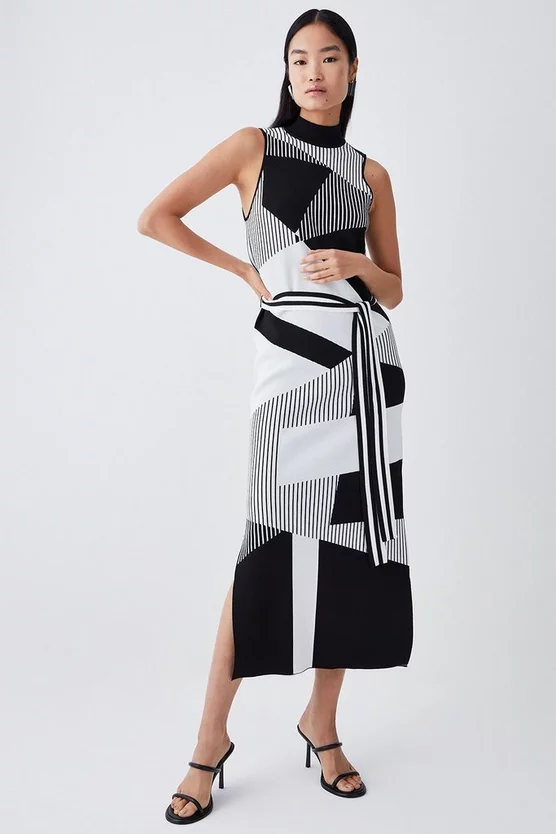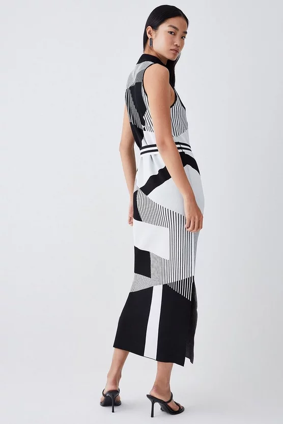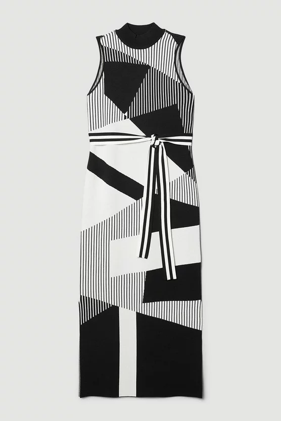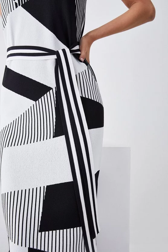 Designed to make an impact, this monochrome geometric print dress will suit a multitude of occasions. Crafted with a soft knit jacquard blend, this dress drapes elegantly down the silhouette, while a wrap belt subtly cinches the waist.