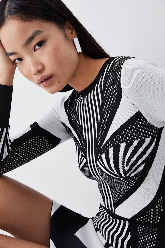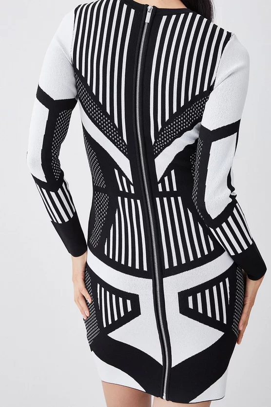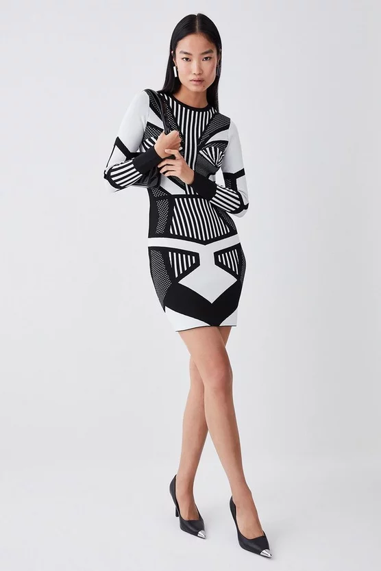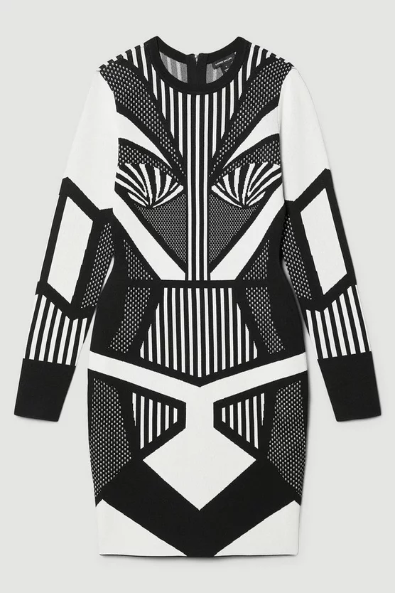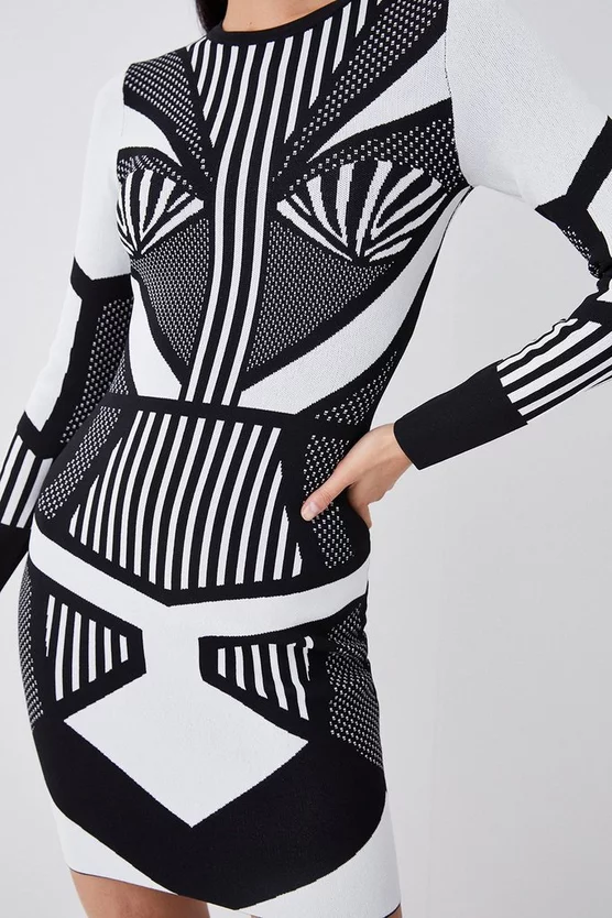 This contemporary design creates an optical illusion of contrast panels and monochrome prints. Crafted with a soft knit jacquard blend, this dress hugs the form with elegant appeal.