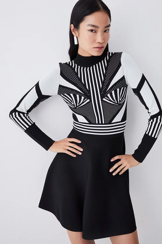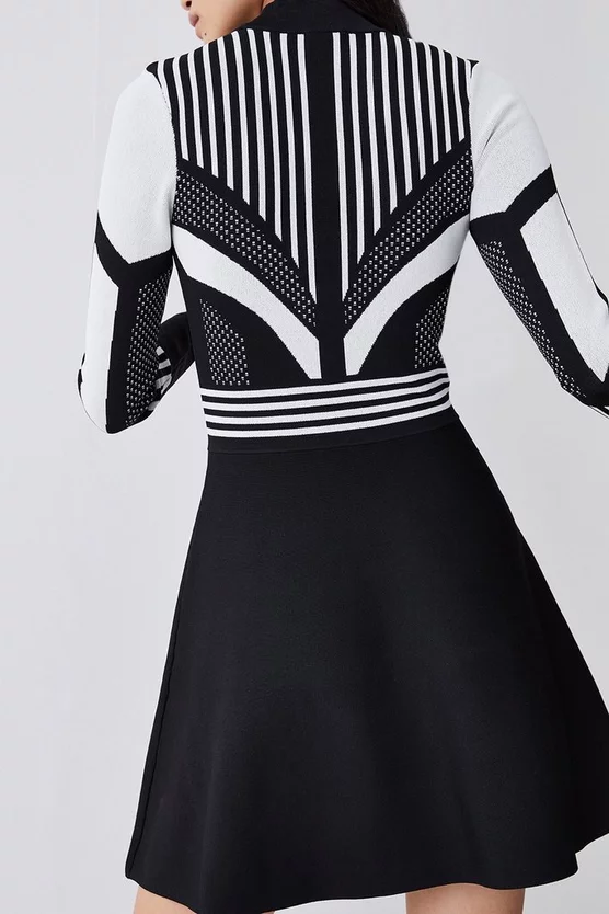 Designed to make an impact, this monochrome geometric print skater dress is a versatile piece. Crafted with a soft knit jacquard blend, this dress drapes elegantly down the silhouette and flares out to an A-line skirt.