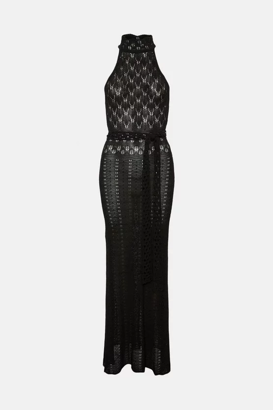 Embrace bohemian glamour on the beach and beyond in this statement maxi dress. Blending luxe open-stitched fabric with a languid, draped silhouette, it looks effortless layered over the seasonβs seductive swimwear on hot summer days and features a halter neckline, semi-sheer knitted finish and slinky, sultry vibe perfect for balmy cocktail hours.