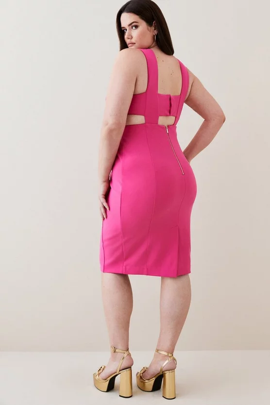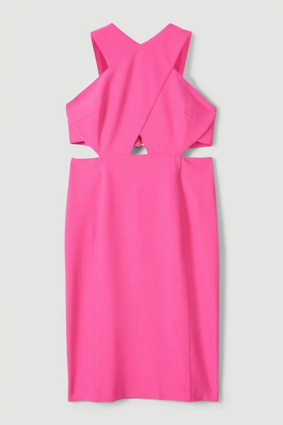 Contemporary and classic in equal parts, this midi dress contours the silhouette with a figure form fit. Punctuated with the modern addition of cutaway panelling, the wrap front leads into a close pencil skirt.
