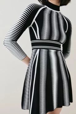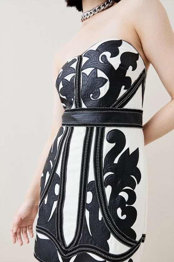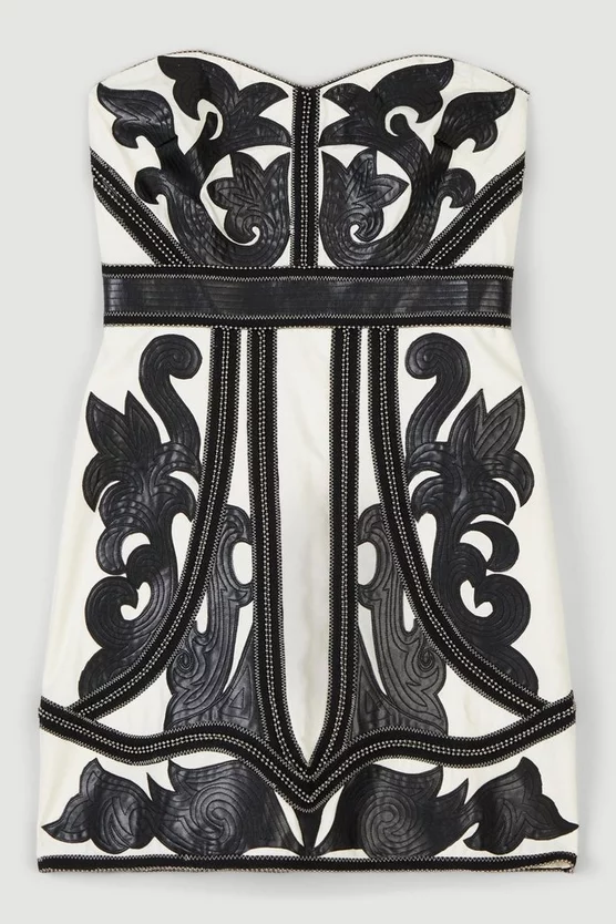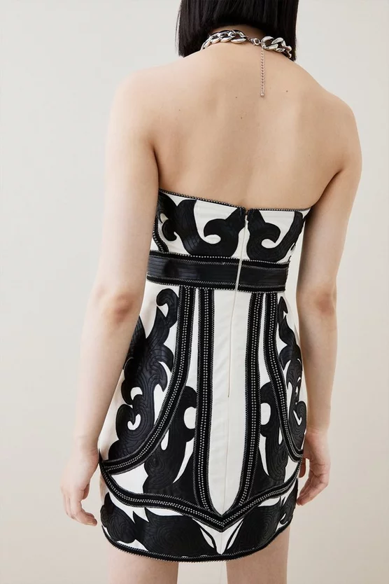 Crafted with contrast brocade-inspired detailing, this mini dress is an inspired foray into decadent, after-dark aesthetics. With embellished panels running throughout, pair this piece with bold lips and streamlined stilettos.