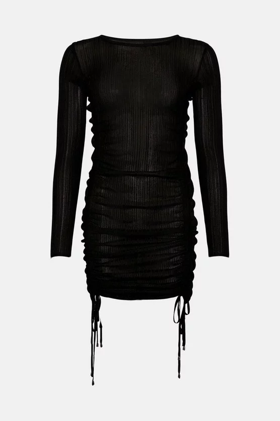 Inspired by the ’90s, this ruched knit dress is a perfect addition to romantic or social evenings. Ribbed to flatter the form, it seamlessly skims the silhouette. The tie details on the hem of the skirt mean you can adjust the ruching to make the skirt longer or shorter.