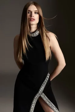 Summer party dressing neednt mean skimping on style, as proven by this opulent satin crepe dress. Cut to a simple, curve-skimming silhouette complete with halter-neck straps, it boasts a flamboyant spray of feathers at the hem for a beautifully dressed-up finish. The sultry front hem split allows elegant ease of movement as you step stylishly into your next party.