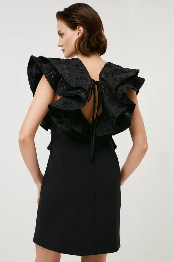 Turn up the volume in this distinctive mini dress. Dramatically defined by layered short sleeves that shimmer in the midnight hour, it has a contrasting streamlined body that skims the figure with balanced allure. A bandeau neckline, wrap-style skirt and precise split hem finish this dimensional piece. Amp it up with oversized jewels and towering platforms for a night to remember.