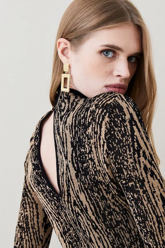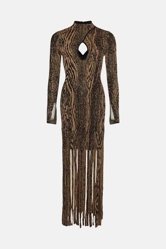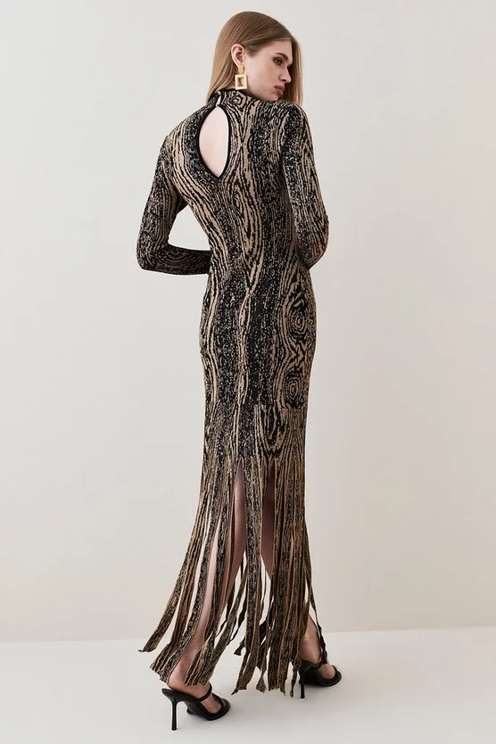 Play with texture and proportion in this unique maxi dress. Spun from slinky knit fabric infused with sparkling threads, it skims the figure beautifully, draping down to a spliced, swishy hem for a sense of movement. Long, split-cuff sleeves accent a crossover neckline and modern front and back cut-outs, adding to its opulent, otherworldly appeal.