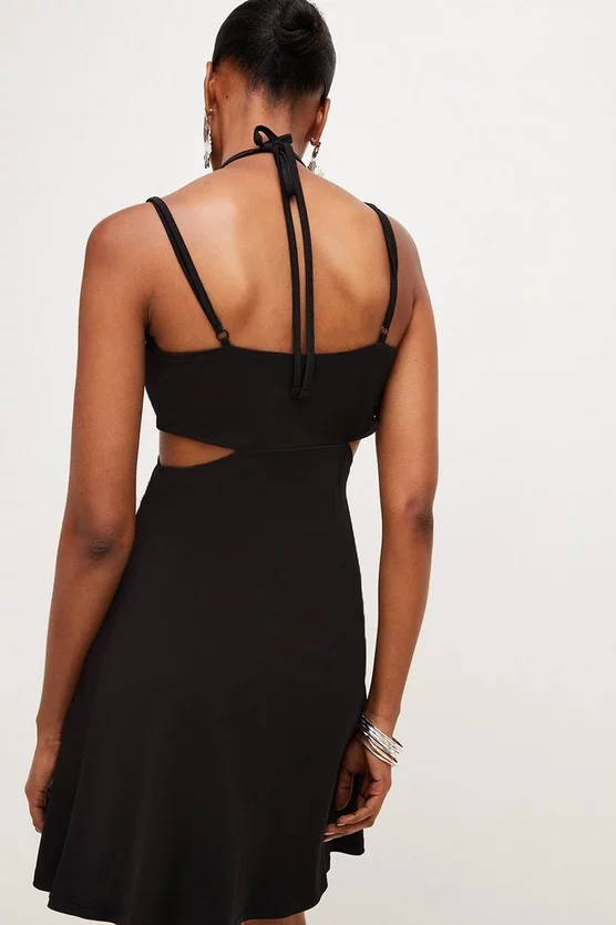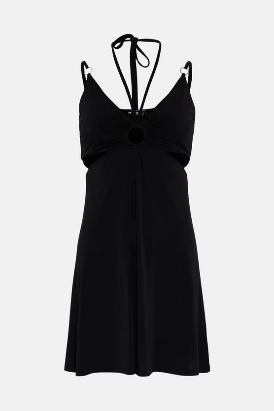 The perfect summer dress. Detailed with two sets of straps and unique circular clasps, this soft black jersey style adds a modern twist to sun-drenched adventures and features sultry side cut-outs and a flirty mini skirt.