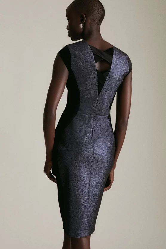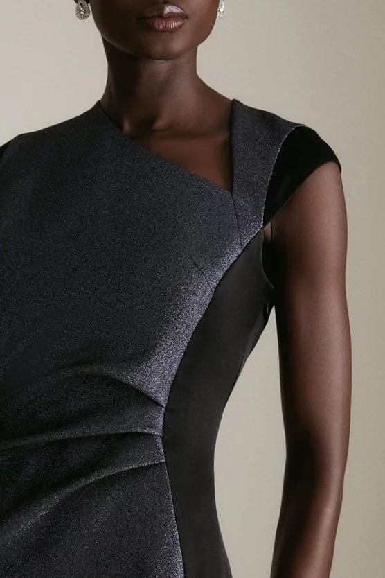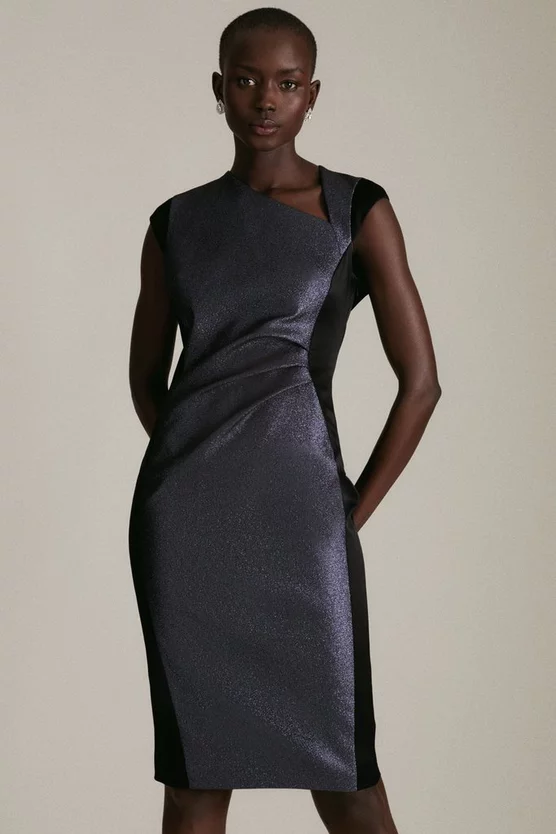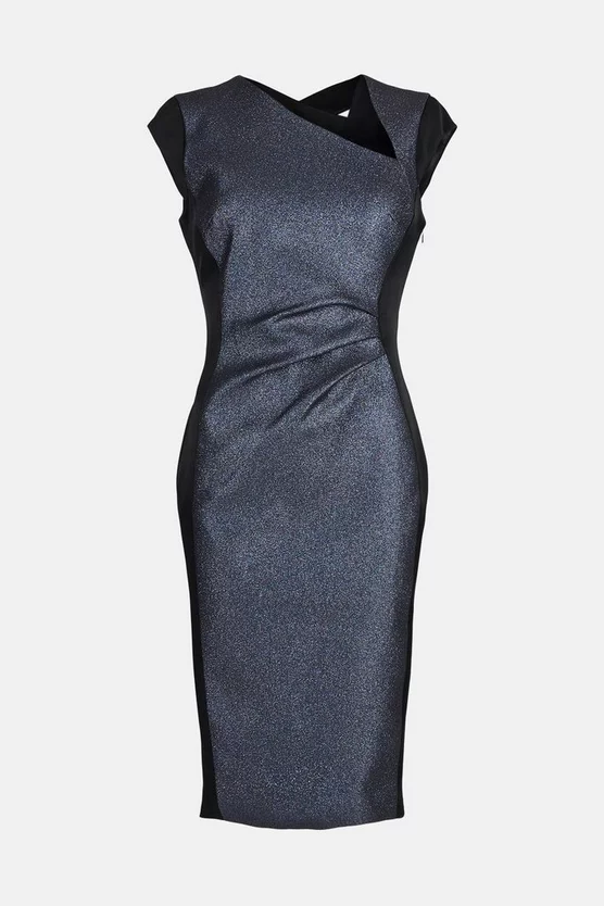 An asymmetric neckline and streamlining panels make this metallic pencil dress a key contender for your new favourite party piece. Pour yourself into this chic cap-sleeved design for a look thatβs sure to get compliments.