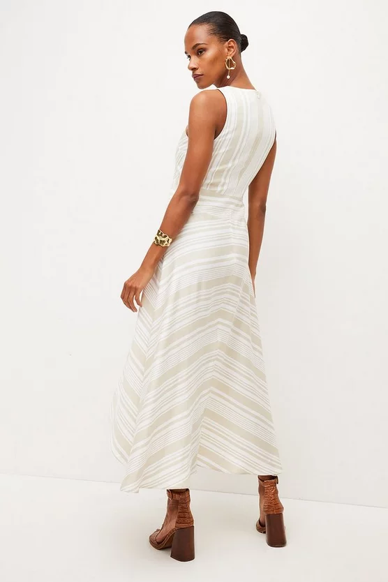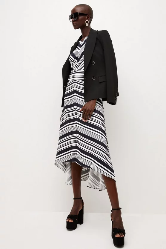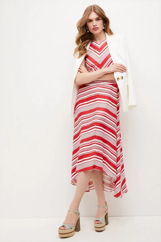 Sunny stripes lend a joyful feel to this floaty summer-ready midi dress. Featuring thick straps and an airy, high-low hem, it ripples elegantly over curves and makes a style-savvy choice for your next balmy-day wedding.